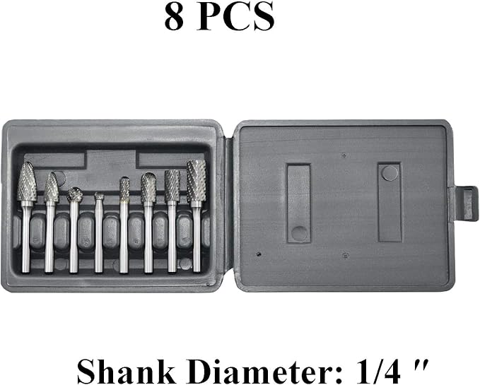 Carbide Burr Set 8pcs with 1/4''Shank Double Cut Solid Power Tools Tungsten Carbide Rotary Files Bits for Die Grinder Metal Wood Carving Engraving Polishing Drilling Grinding Milling Cutting